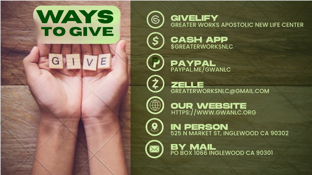 You can give using Givelify and Paypal!To submit your contribution, click the donation button below to… Cash App: $GreaterWorksNLC You can also mail a check or money order to:Greater Works Apostolic New Life Center P.O. Box 1066, Inglewood, CA 90308
